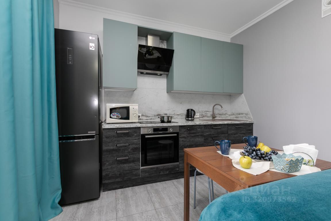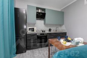 На кухонной зоне: кухонный гарнитур с подсветкой, плита с духовым шкафом, большой холодильник, вытяжка и обеденная зона на двоих. Односпальное кресло-кровать.