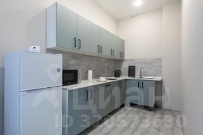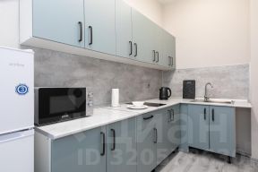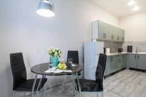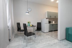 На кухонной зоне: кухонный гарнитур, варочная поверхность, холодильник с морозильной камерой, микроволновка и обеденная зона на троих.