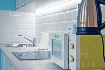 Комната совмещена с мини-кухней. На кухне большой холодильник, микроволновая печь, электрический чайник, варочная поверхность и необходимый набор посуды.