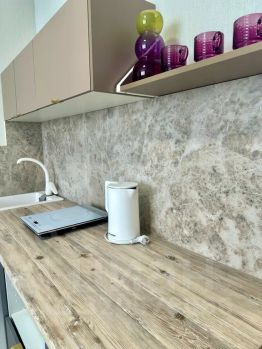 - Современная кухня, оборудованная всем необходимым для приготовления пищи: холодильник, микроволновая печь, индукционная плита и посуда.