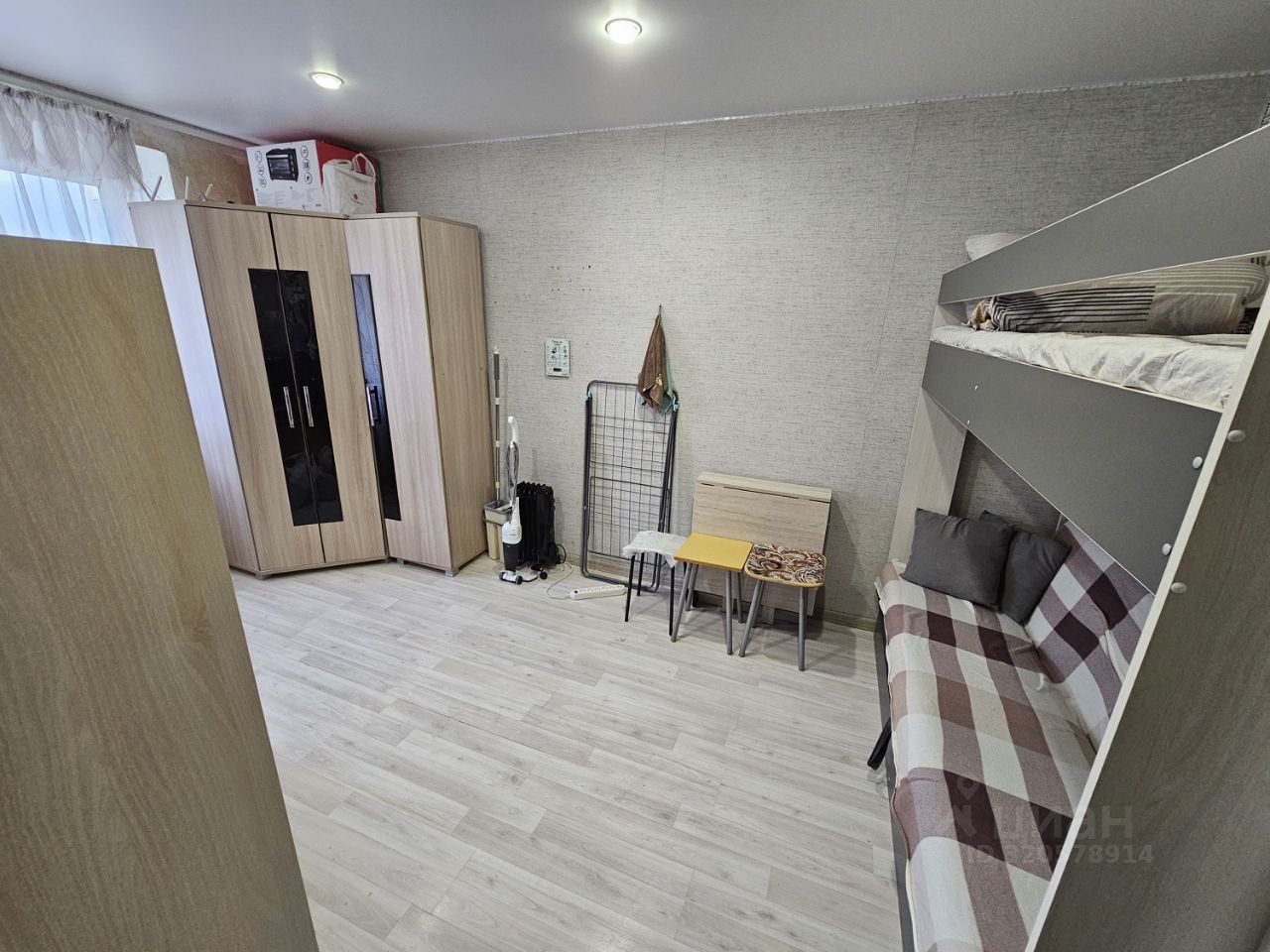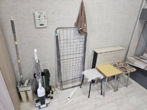 Техника: холодильник, микроволновка (на кухонном гарнитуре в общей комнате), пылесос, обогреватель (в случае, если холодно).