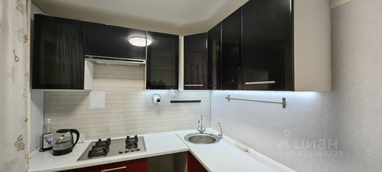 На кухне есть полноценный кухонный гарнитур, стол, пара стульев. Из техники есть газовая варочная поверхность, электрический духовой шкаф, электрический чайник. Есть место под посудомойку (если решите ее установить).
