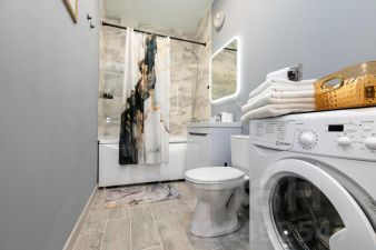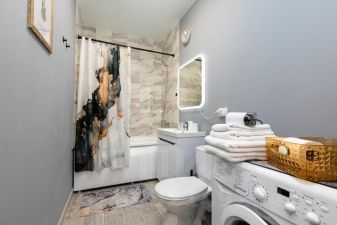 В ванной комнате большое зеркало с подсветкой, стиральная машина и фен. В прихожей вместительный шкаф для размещения с комфортом всей семьи.