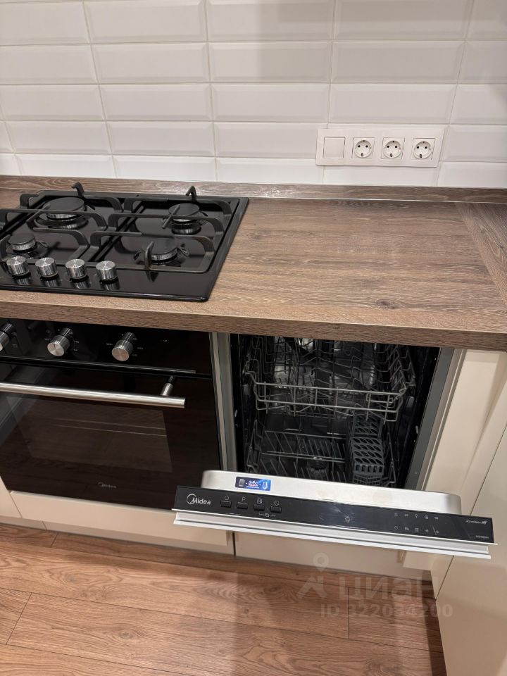 На кухне: кухонный гарнитур, новый холодильник, посудомоечная машина, духовой шкаф, плита, обеденный стол и стулья.