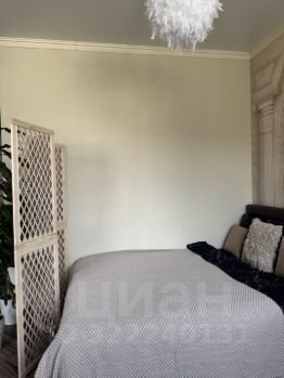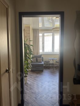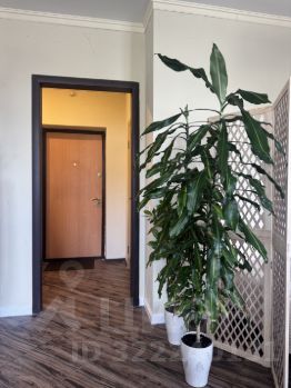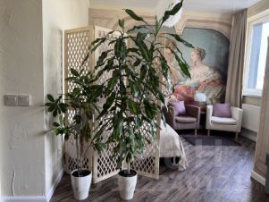 В квартире есть деревянная перегородка и живые цветы, которые добавляют тепла и природной свежести интерьеру. Всё вместе создаёт уютную, стильную и вдохновляющую обстановку.