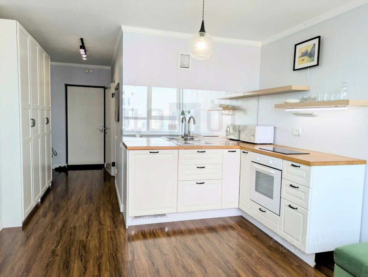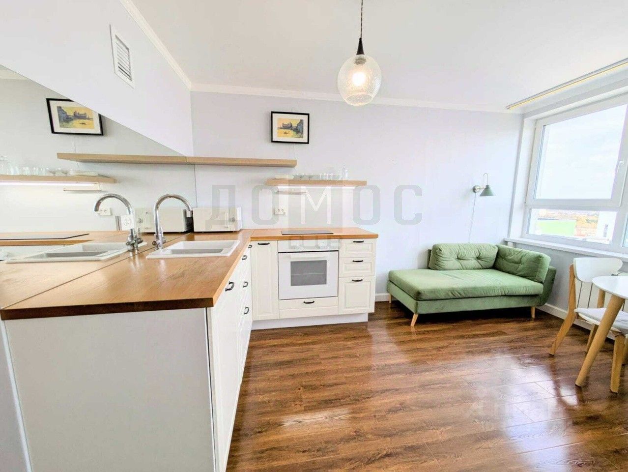 Большая Кухня-Гостиная правильной формы, легко разместит счастливую семью и ваших гостей. Кухонный гарнитур оборудован всей необходимой техникой и обеденной зоной. Есть посуда.