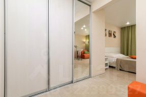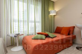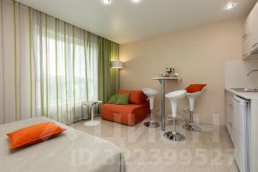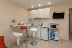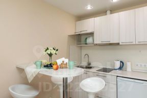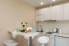 Квартира-студия, поэтому в кухонной зоне для максимальной компактности стоит барная стойка. На кухне - варочная поверхность, чайник, маленький холодильник (с морозилкой) микроволновка и необходимый набор посуды, чтобы можно было что-то приготовить.