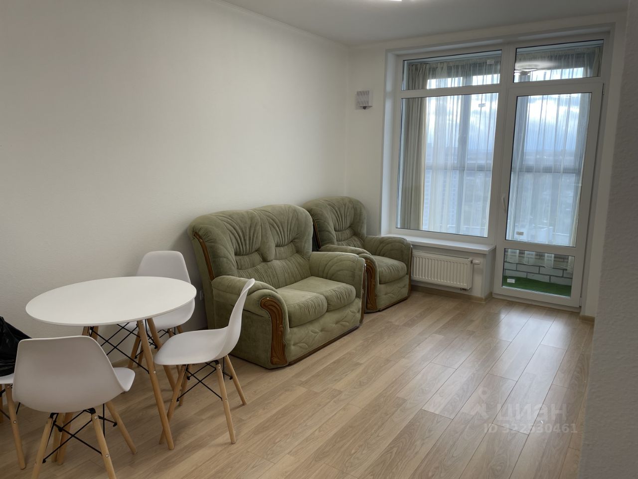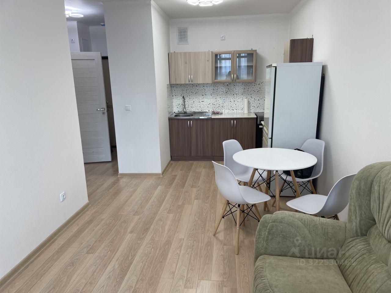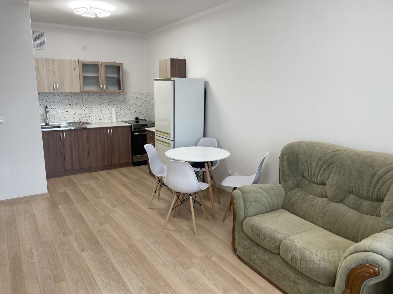 В квартире имеется кухонный гарнитур, электрическая плита Gorenje, холодильник Stinol. Мягкая мебель - диван и кресло.