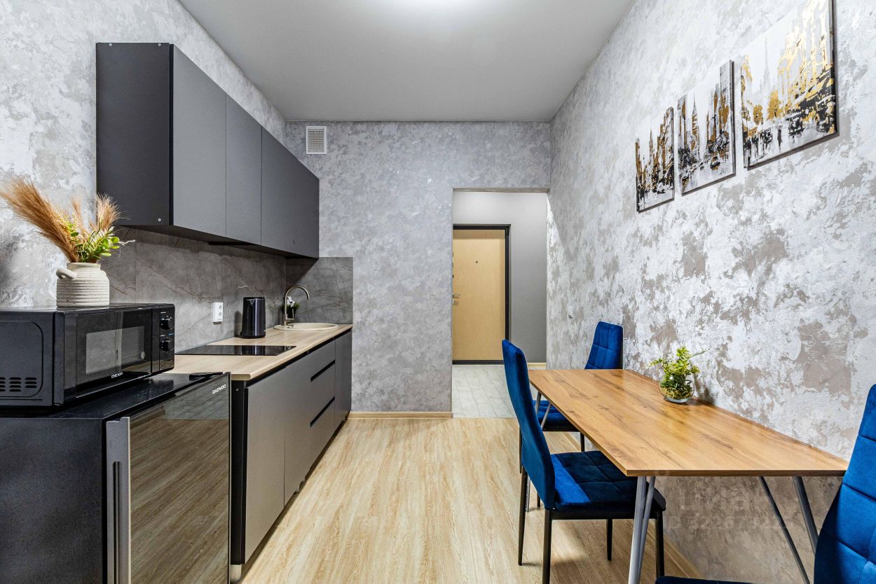 - Полностью оборудованная кухня — вся бытовая техника, посуда и столовые приборы.