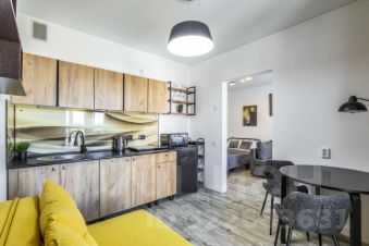 - Полностью оборудованная кухня — вся бытовая техника, посуда и столовые приборы.