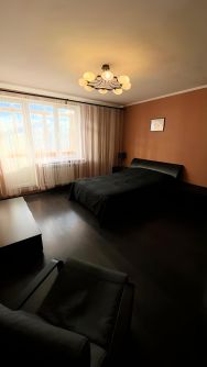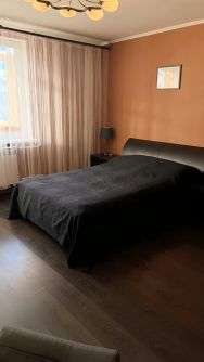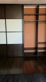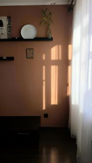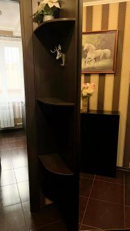 По левую руку от входа минуя арку из темного дерева справа за дверью от Краснодеревщиков расположилась уютная кухня с обеденным столом, холодильник(за которым стойка для хранения 19 л бутылей для воды), кухонным гарнитуром с множеством мест для хранения, газовая панель, электрическая духовка, вытяжка, микроволновая печь и если необходимо стеклянная посуда IKEA. Вернувшись в коридор и минуя вторую деревянную арку попадаем в большую комнату, полы ламинат, с 6 секционным шкафом купе во всю высоту квартиры(очень много места для хранения), комната исполнена в карамельных оттенках, имеет кресло качалку IKEA, длинную ТВ тумбу с 3 ящиками хранения, журнальный столик, на стене две полки и рамки под личные фотографии и элементы интерьера. В данный момент в комнате расположена двуспальная кровать с прикроватной тумбой и лампой, но можно переоборудовать в гостиную и перенести кровать в малую комнату. Большая комната имеет выход на балкон, полы керамогранит, облицовка древесина, с панорамным видом 90 градусов на юго-запад, поэтому вы не пропустите ни один закат.
