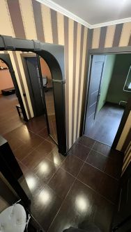 По правую руку от входа удобно для быстрого пользования (даже в верхней одежде) расположен совмещенный санузел с ванной, стиральной машиной, шкафами для хранения, активной вытяжкой(но при этом курение в квартире строго запрещено), бойлером на 35л и электро полотенце осушителем. Далее по коридору светлая малая комната в тонах елового леса, полы прочный ламинат, может быть использована как спальня, кабинет для работы или дет. комната (около 9-10 м2).