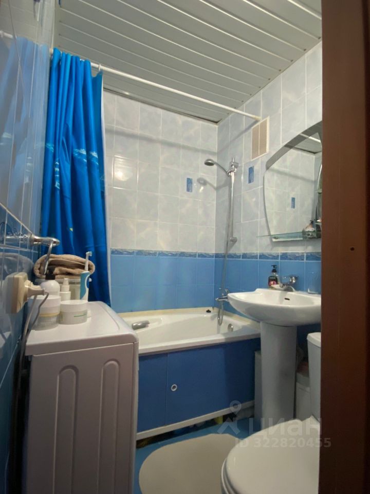 Ванная комната с туалетом чистая и опрятная со светлым кафелем в сине-белом цвете.