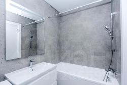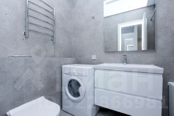 В студии совмещенный санузел с ванной, стиральной машиной, а также раковиной с зеркальной подсветкой.