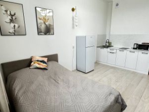 * Стильная кухня с техникой (холодильник, микроволновка, электрический чайник, вся посуда)