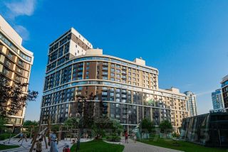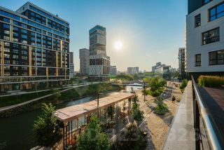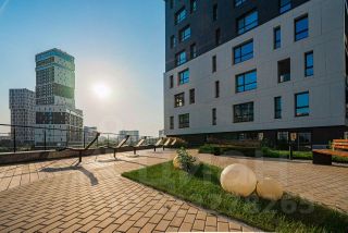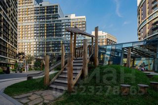 Во дворе расположен балкон с шезлонгами и современная детская площадка и пруд
