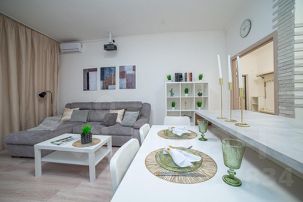 - Полностью меблированная квартира: Современная мебель и все удобства включены, техника вся работает