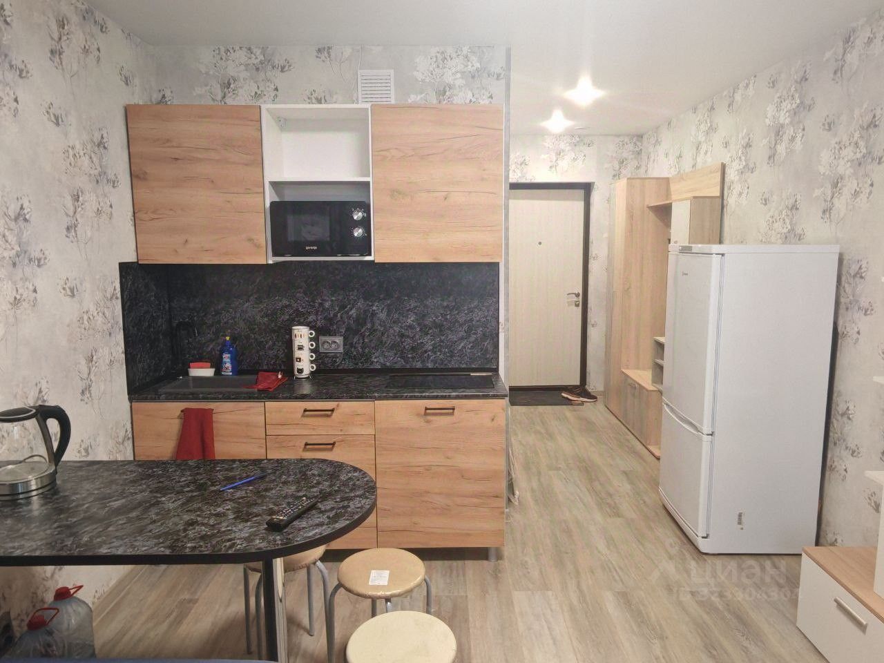 В квартире сделан качественный евроремонт. Пространство студии продумано до мелочей: уютная мебель на кухне и в комнате создаёт комфортные условия для проживания. В наличии вся необходимая техника: холодильник, телевизор и стиральная машина, микроволновая печь. Совмещённый санузел оборудован современной душевой кабиной, имеется теплый пол. Лоджия станет приятным местом для отдыха.
