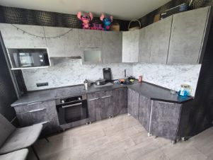 Диван, стол, кухонный уголок, большая гардеробная из секции шкафов, просторная встроенная кухня, холодильник, микроволновка.