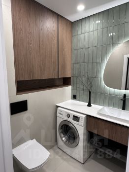 Санузел совмещенный: теплый пол, подвесной унитаз, ванная с душевой системой, стиральная машина, большой шкаф для хранения.