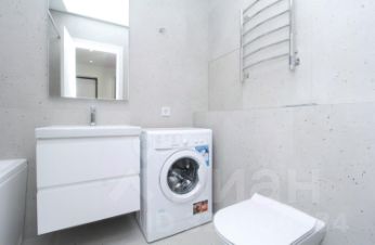 В студии совмещенный санузел с ванной, стиральной машиной, а также раковиной с зеркальной подсветкой.