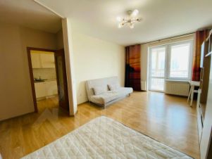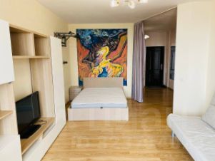 Удобная планировка, огромная лоджия с панорамным остеклением, просторная кухня и комната(в которой комфортно разместилась зона сна и гостинная).