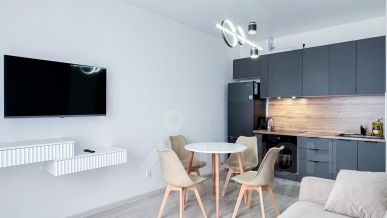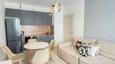 - Современная кухня, оборудованная всем необходимым для приготовления пищи: холодильник, микроволновая печь, индукционная плита и посуда.