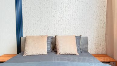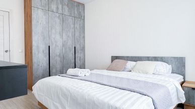 - Просторная спальная зона с комфортной двуспальной кроватью. Мягкие подушки и плед добавляют уюта.