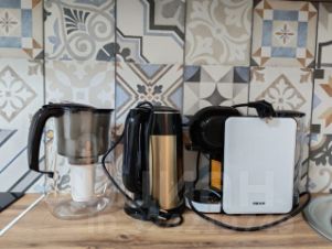 - Полностью оборудованная кухня с электрической плитой, микроволновой печью, холодильником, электрочайником и набором посуды.