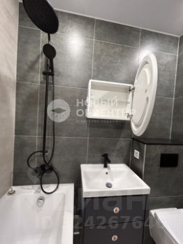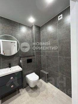 В санузле на полу и стенах керамогранит, инсталляция, раковина с тумбой, зеркальный шкаф с подсветкой.