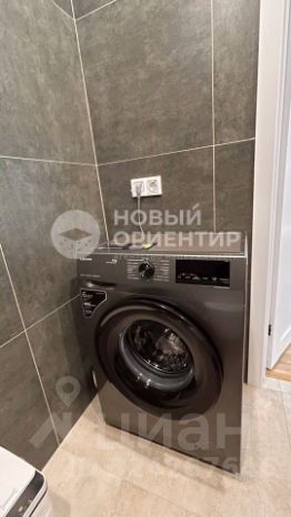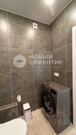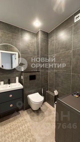В санузле на полу и стенах керамогранит, инсталляция, раковина с тумбой, зеркальный шкаф с подсветкой, стиральная машина.