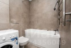 В студии совмещенный санузел с ванной, стиральной машиной, а также раковиной с зеркальной подсветкой.
