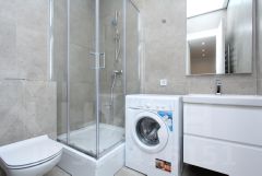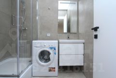 В студии совмещенный санузел с душем, стиральной машиной, а также раковиной с зеркальной подсветкой.