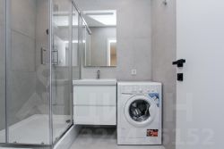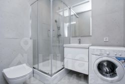 В студии один совмещенный санузел с душевой кабиной, стиральной машиной, а также раковиной с зеркальной подсветкой.