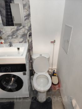 В ванной комнате туалет, шкаф-пенал, ванная, коврики, швабра для уборки, стиральная машинка.