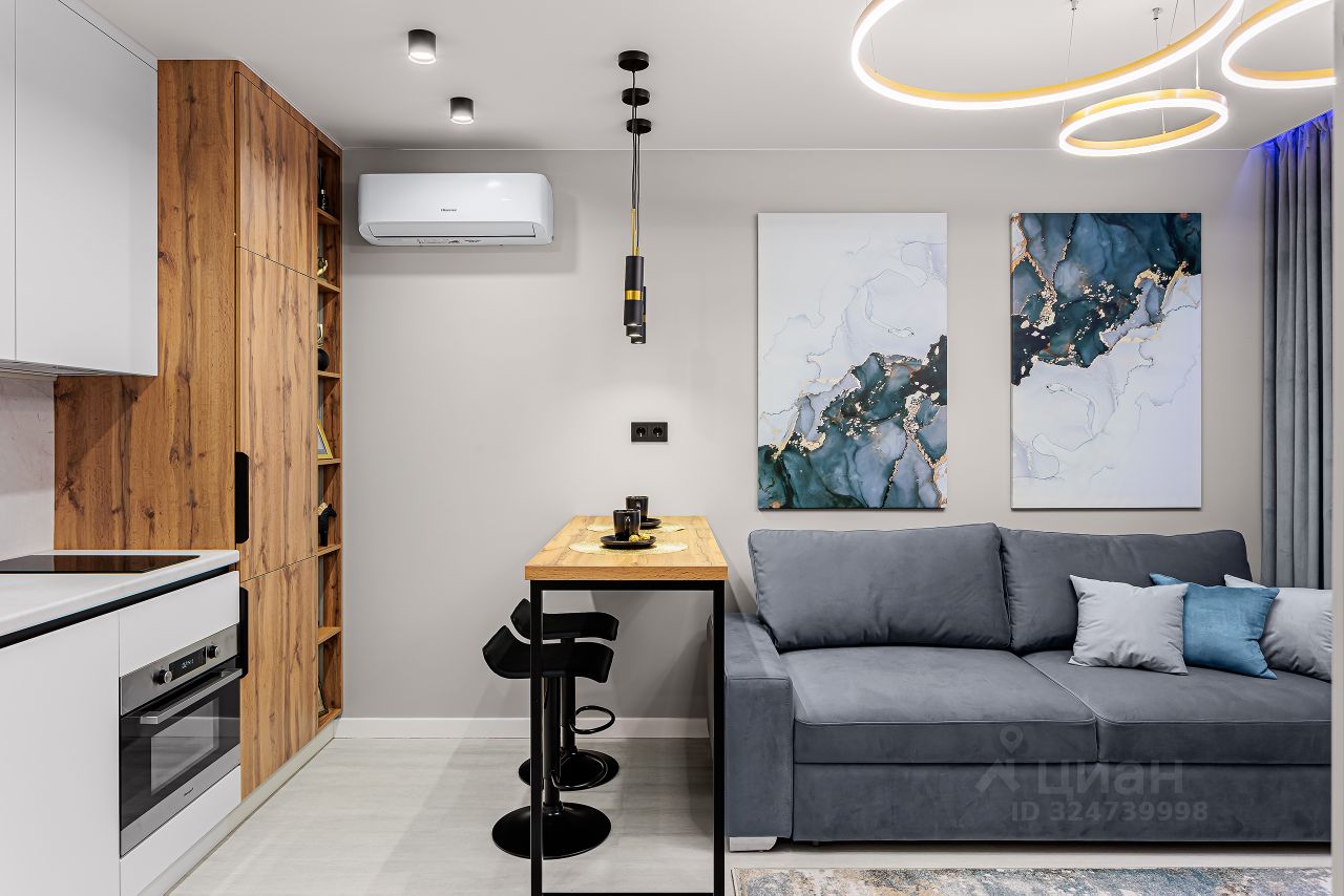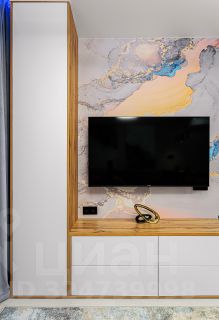 В гостиной окна выходят на застекленную лоджию, очень светло! Имеется телевизор, ТВ-тумба с большим пространством для хранения, мягкий диван со спальным местом и кондиционер, а также карниз с подсветкой для создания нужного настроения!