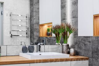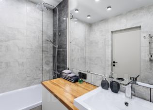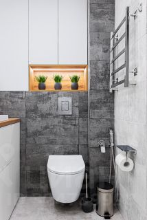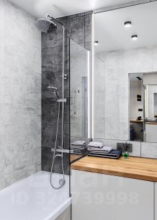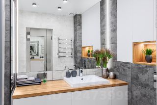 Ванная просторная, с декором и огромным зеркалом, оборудована теплым полом, водонагревателем, системой от протечек воды и стиральной машиной! Есть хозяйственный шкаф.