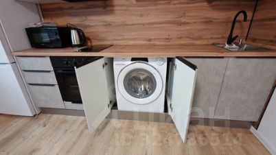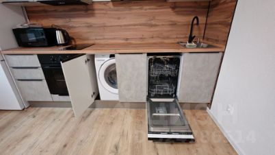 Техника: Вся новая — индукционная плита, вытяжка, холодильник, посудомоечная машина (45 см), стиральная машина с функцией сушки, микроволновка.