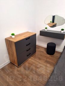 Уютная комната с большой двуспальной кроватью, большим комодом и удобным столиком для работы или макияжа.