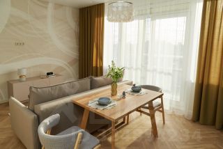 В квартире сделан дизайнерский ремонт, который подчёркивает её современный стиль и элегантность. В наличии вся необходимая мебель и техника: кондиционер, холодильник, посудомоечная машина и стиральная машина, а также телевизор. Удобная планировка включает в себя совмещённый санузел с душевой кабиной и две лоджии. Квартира оснащена интернетом, что делает её ещё более комфортной для проживания.