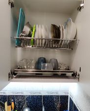1. Кухонный гарнитур, холодильник, чайник, плита, набор посуды, свч, стол, стулья.