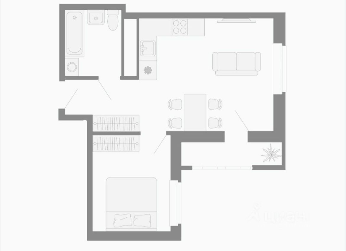 Кухня совмещена с гостиной, отдельная спальная. Санузел совмещённый.