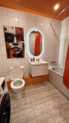 Апартаменты обставлены со вкусом новой современной мебелью в светлых тонах с яркими акцентами в кухонной и ванной зоне.