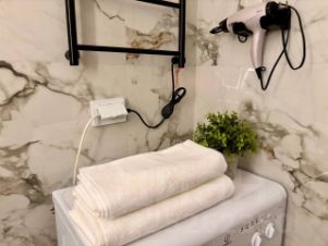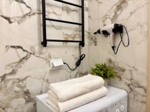 В ванной есть сушилка для белья, фен, стиральная машинка, ванна, шампунь, полотенца, туалетные принадлежности