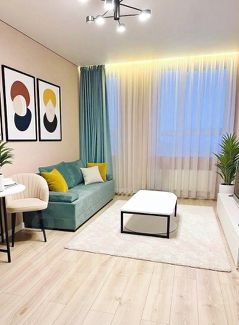 светлая и просторная гостиная с удобным диваном и телевизором со Smart TV;