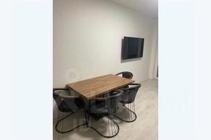 Апартаменты обставлен со вкусом новой современной мебелью в светлых тонах с яркими акцентами в кухонной и ванной зоне.