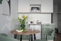 Микроволновка, чайник, варочная панель, холодильник и набор стильной посуды — всё для приготовления праздничных завтраков или ужинов.