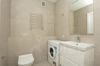 В студии совмещенный санузел с ванной, стиральной машиной, а также раковиной с зеркальной подсветкой.