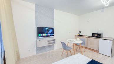 Cоврeменнaя и уютная студия c новым cтильным peмoнтoм — идеальноe место для oтдыха или кoмaндиpoвки.