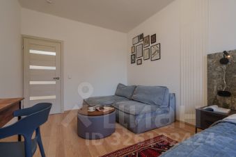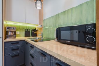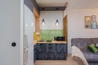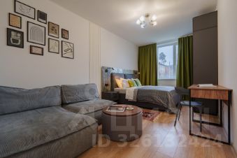 Просторная студия с кухонной зоной, гардеробной рабочим местом и большим шкафом для одежды;